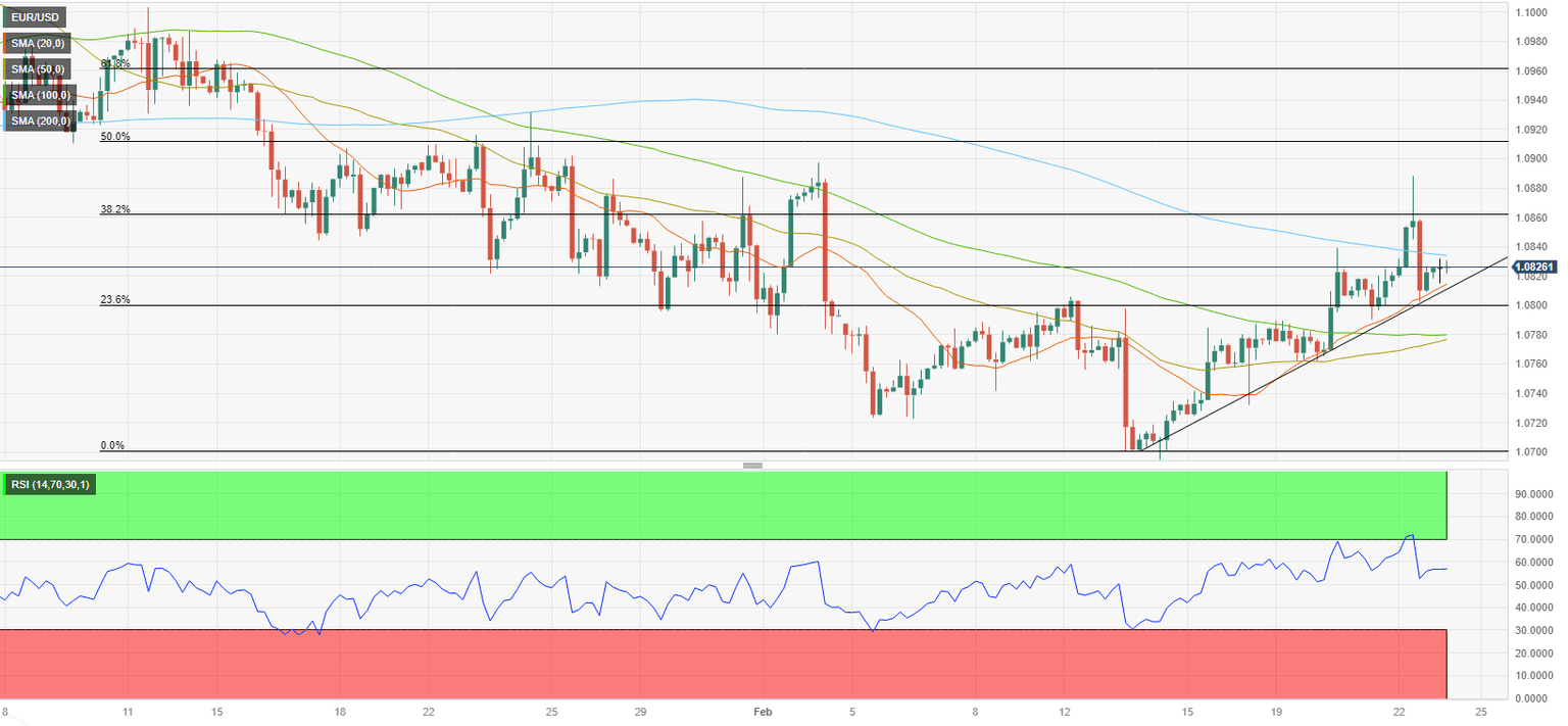 EUR/USD retreated below the 200-period Simple Moving Average (SMA), currently located at 1.0830, on the 4-hour chart and closed the last 4 4-hour candles below that level. On an encouraging note for the bulls, the pair holds above the ascending trend line and the Relative Strength Index (RSI) indicator stays above 50.