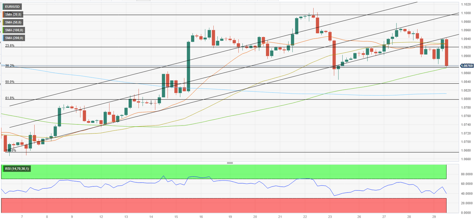 EUR/USD was last seen trading near 1.0870, where the Fibonacci 23.6% retracement of the latest uptrend and the 100-period Simple Moving Average (SMA) on the 4-hour chart align. If the pair starts using that level as resistance, sellers could target 1.0840 (Fibonacci 50% retracement) and 1.0815 (200-period SMA) next.