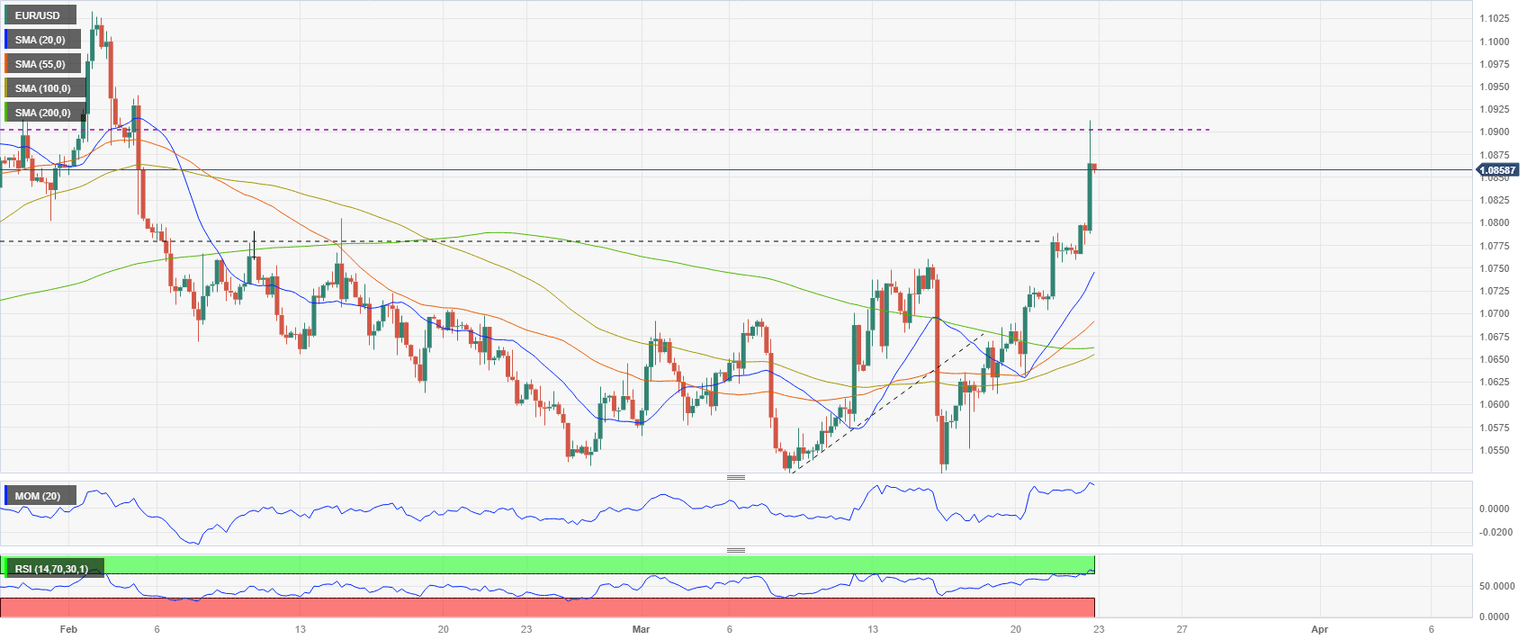 The EUR/USD rose for the fifth consecutive day. The daily chart shows a clear bullish bias but some exhaustion signs suggest some consolidation before the next leg higher, unless a sell-off of the US Dollar sends the pair back above 1.0900. The mentioned level is a critical area that should limit the upside for the moment. On Wednesday, EUR/USD broke decisively above the 1.0800 area. It peaked at 1.0911, 400 pips above last week’s low. After such a rally, some consolidation is on the table.