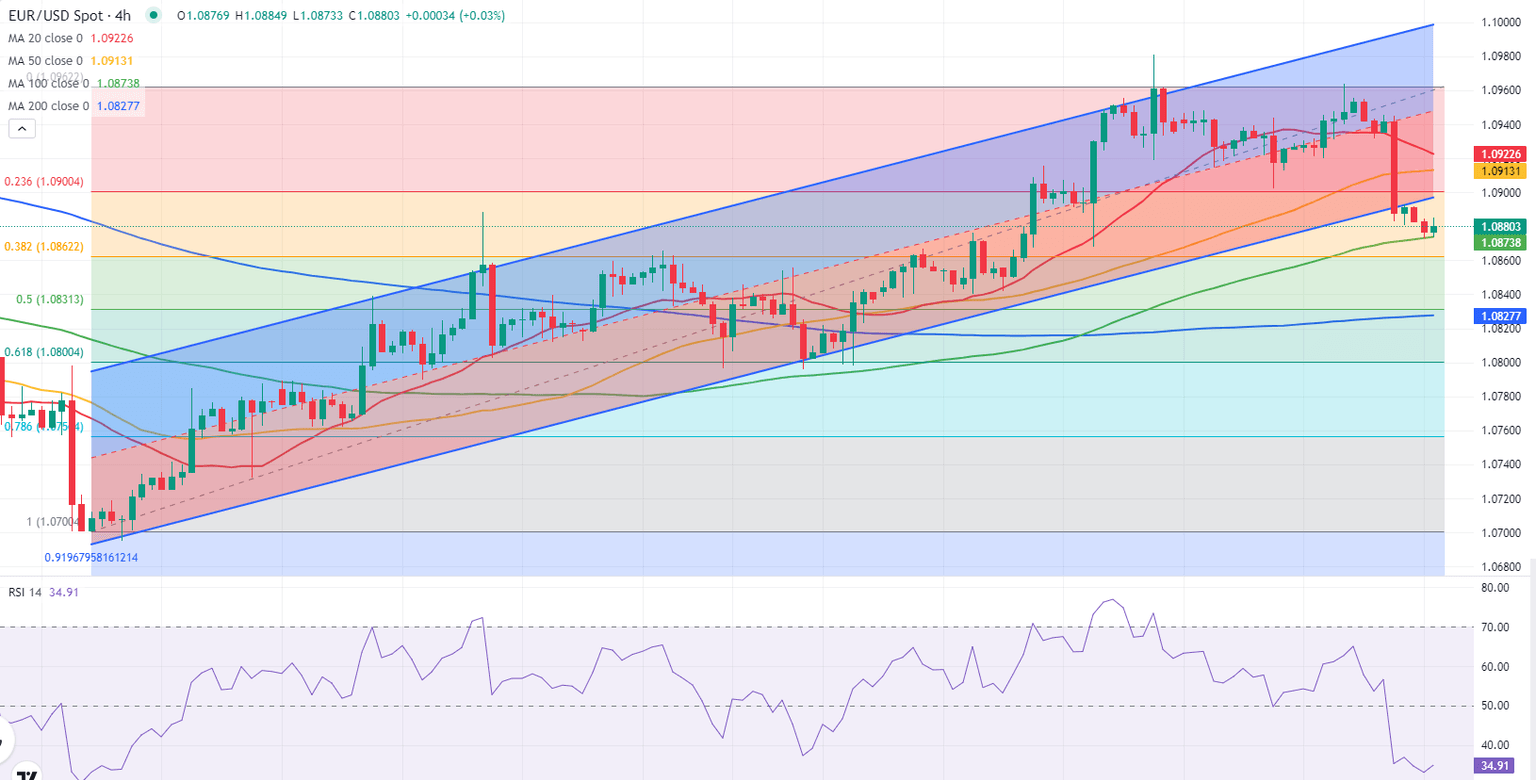 - EUR/USD trades below 1.0900 after posting large losses on Thursday.