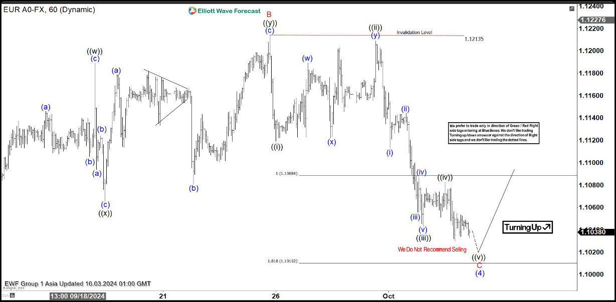 Short term Elliott Wave view in EUR/USD suggests that cycle from 4.16.2024 low is in progress as a 5 waves impulsive Elliott Wave structure. Rally to 1.12 ended wave (3) of the impulse. Pullback in wave (4) is now in progress with internal subdivision as an expanded Flat structure. Down from 8.26.2024 high, wave A ended at 1.10. Rally in wave B unfolded as a double three Elliott Wave structure. Up from wave A, wave ((w)) ended at 1.1189 and pullback in wave ((x)) ended at 1.1065. Wave ((y)) higher ended at 1.1213 which completed wave B.