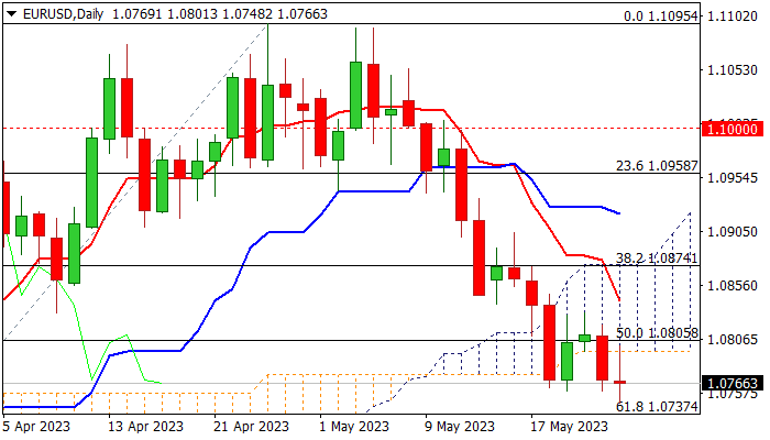Conflicting daily studies lack direction signal, with break of supports at 1.0760/37 (base / Fibo 61.8% of 1.0516/1.1095) to signal bearish continuation, while penetration of daily cloud (base lays at 1.0796) and extension through falling daily Tenkan-sen (1.0841) would generate initial reversal signal, which will require verification on lift above cloud top (1.0874).