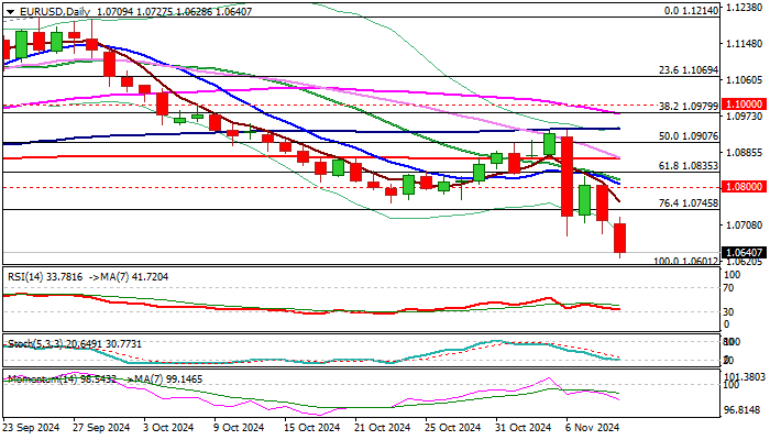 Fresh strength of the US dollar pushed the euro to the lowest in over 6 months on Monday, with steep downtrend (bear-leg from 1.0936, Nov 5 lower top) eyeing key med-term support at 1.0601 (2024 low posted on Apr 16).