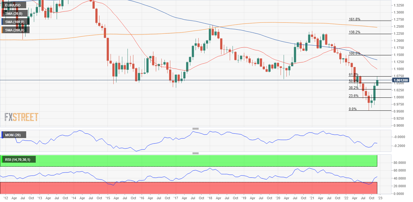 Ever since the end of 2014, the 1.1460/80 price zone has been a tough bone to break one way or the other. With EUR/USD trading over 800 pips below the level, and with prospects of additional rate hikes at both shores of the Atlantic, the chances that the pair could reach such a price zone in the first quarter of 2023 are not much. However, if it manages to clear the aforementioned Fibonacci resistance, the pair can advance towards the 1.1060/1.1120 price zone. For the tie to chance and bulls to retake long-term control of the pair, a monthly close above 1.1500 would be required.
