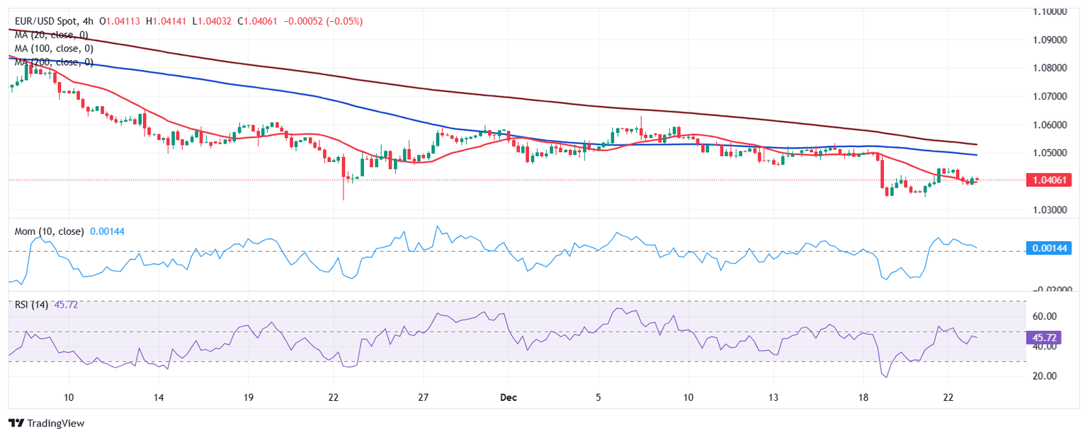 The EUR/USD pair finishes the American session as it started it, trading around the 1.0400 threshold. Financial markets are in a winter holiday mood, with Christmas around the corner interrupting activity. The US Dollar (USD) seesawed alongside sentiment, trading within familiar levels throughout the day.