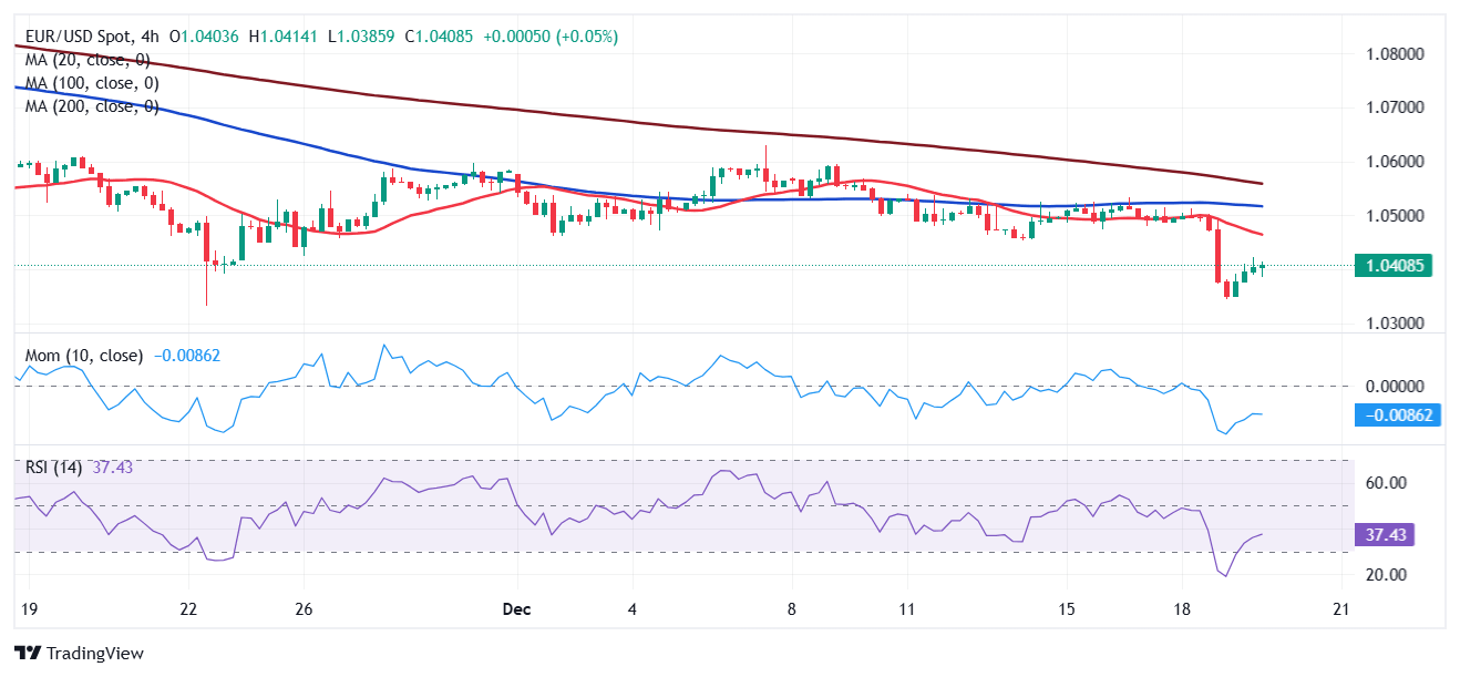 The EUR/USD pair trimmed part of the Fed-inspired losses and traded in the 1.0410 price zone ahead of the American opening on Thursday. The pair fell to 1.0343 following the United States (US) Federal Reserve (Fed) monetary policy announcement on Wednesday. The Fed decided to cut the benchmark interest rate by 25 basis points (bps) as expected, delivering alongside a quite hawkish message heading into the new year.