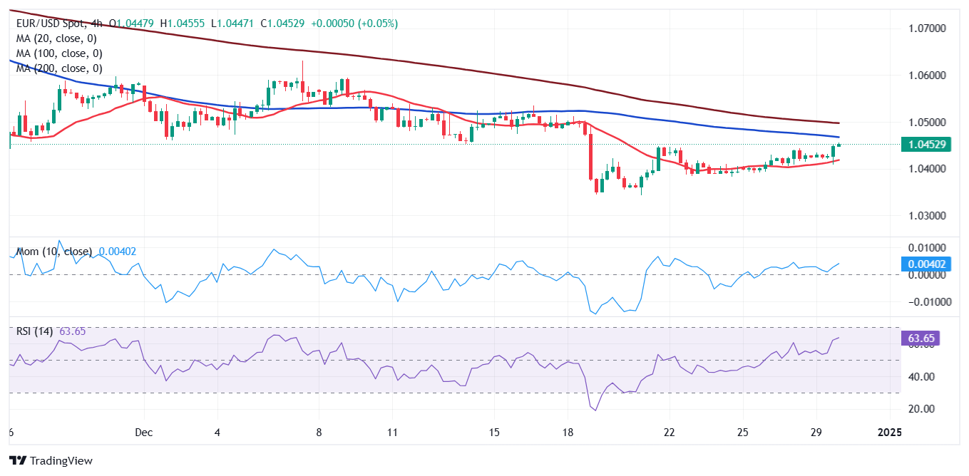 The EUR/USD pair posts a modest intraday advance on Monday, reverting an early slide towards the 1.0400 region. The US Dollar (USD) found near-term demand during Asian trading hours, albeit persistent thin holiday trading limited directional moves across financial boards. The USD, however, shed ground in European trading hours, helping EUR/USD recover towards the current 1.0450 price zone.