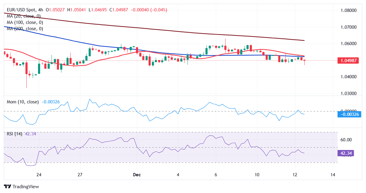 The EUR/USD pair hovered around the 1.0500 mark throughout the first half of the day, trading with a soft tone ahead of the European Central Bank (ECB) monetary policy decision. The central bank delivered as expected and trimmed the three main interest rate benchmarks by 25 basis points (bps), each as expected. Still, the pair showed little reaction to the news. On the contrary, EUR/USD is falling amid the broad US Dollar strength, the latter backed by a persistently sour mood.