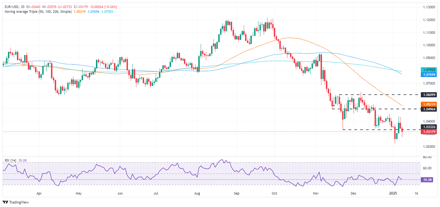 The EUR/USD pair ended Wednesday’s session with modest losses of 0.21% as the US Federal Reserve (Fed) released its December meeting minutes. There, officials hinted that the pace of easing should be slowed. The pair trades at 1.0317.