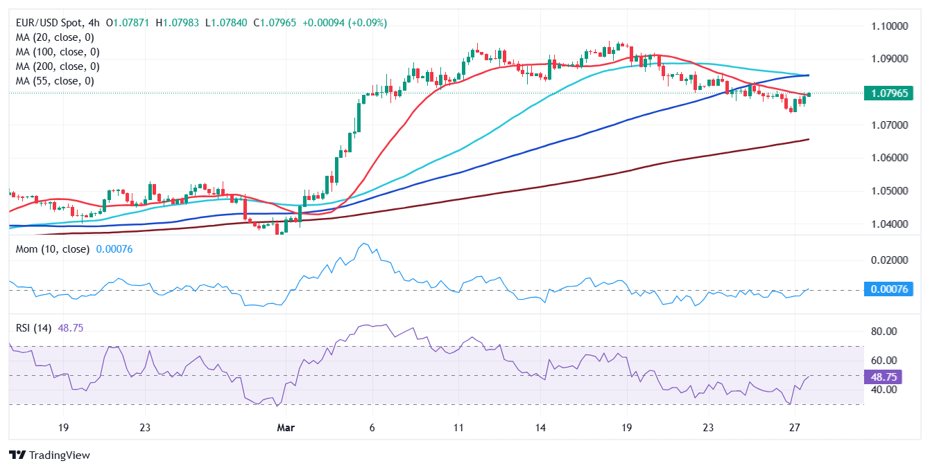 The US Dollar (USD) turned south on Thursday, helping EUR/USD recover from a multi-week low of 1.0733. The pair, however, is meeting near-term sellers around the 1.0800 mark.
