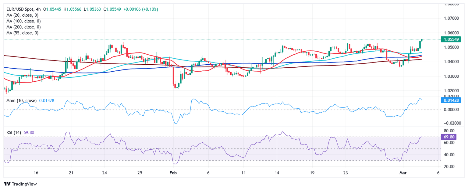 From a technical point of view, the daily chart for the EUR/USD pair shows it is sharply up for a second consecutive day, pressuring the fresh 2025 high at 1.0556. Technical indicators in the mentioned time frame head firmly north, in line with additional gains ahead. Finally, EUR/USD is surpassing a bearish 100 Simple Moving Average (SMA) currently in the 1.0510 region. The 20 SMA advances below the longer one, in line with the dominant upward strength.