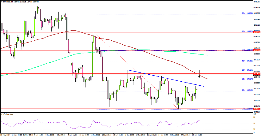 - EUR/USD started a recovery wave above the 1.0710 resistance.