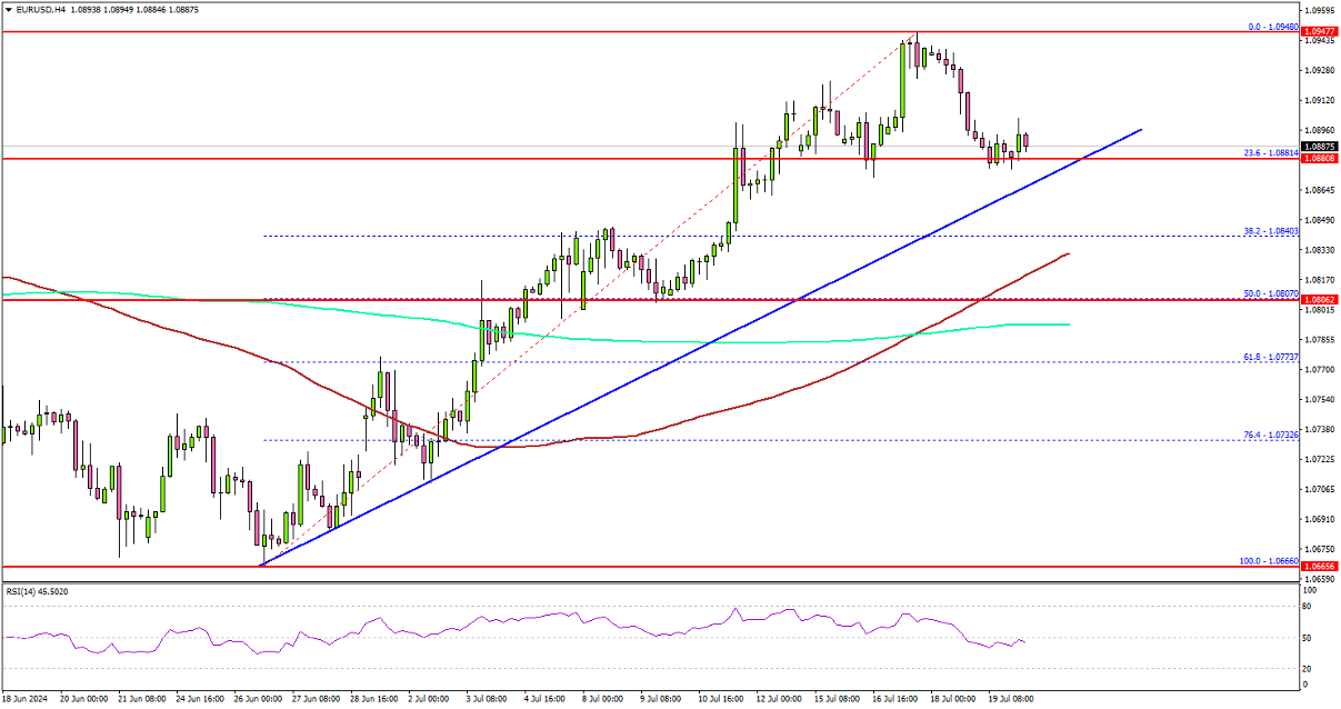 There is also a key bullish trend line forming with support at 1.0870 on the same chart. If there is a fresh increase, the pair could face resistance near the 1.0910 level. The next resistance sits at 1.0920. The main hurdle sits at 1.0950.