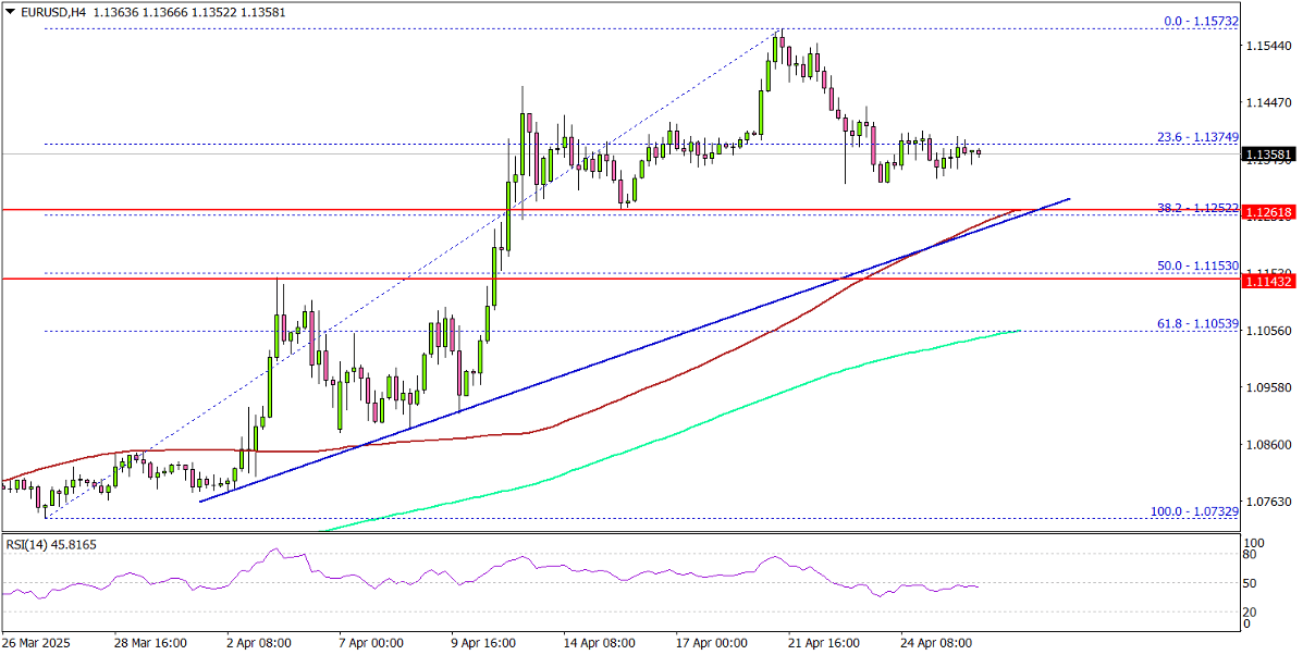- A key bullish trend line is forming with support at 1.1250 on the 4-hour chart.