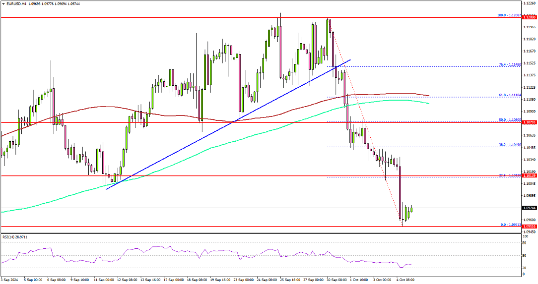 EUR/USD started a fresh decline below the 1.1080 support.