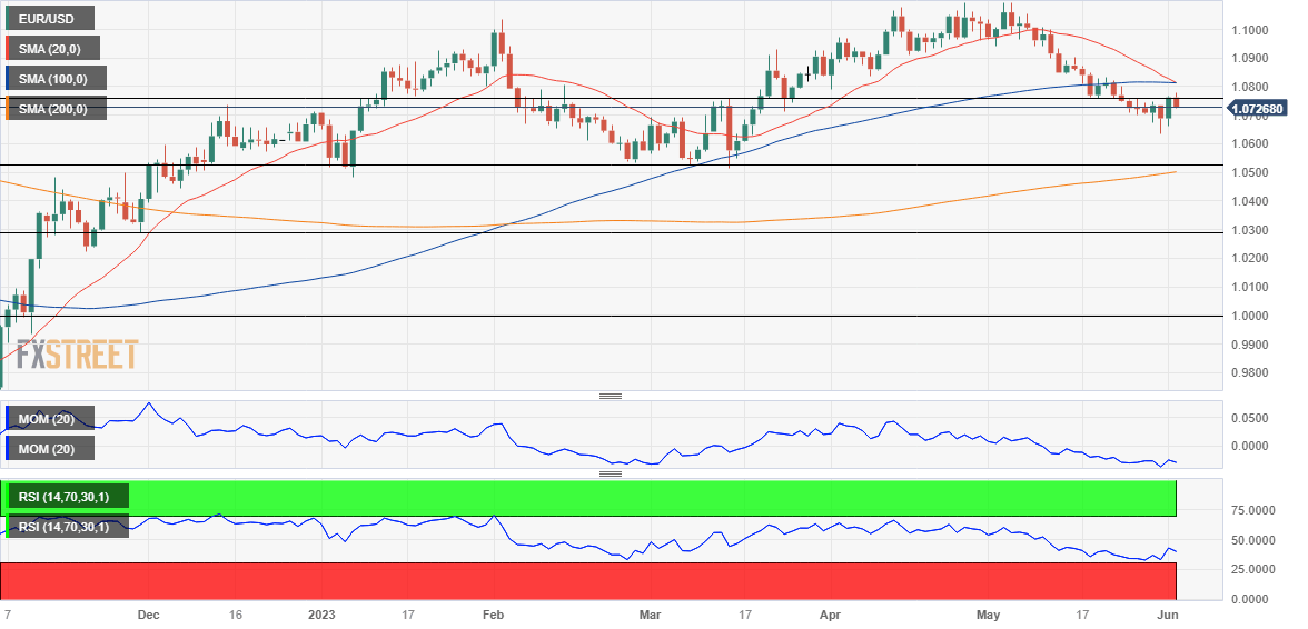 The EUR/USD pair fell throughout the first half of the week, changing course on Thursday after bottoming on Wednesday at 1.0634, its lowest in more than two months. The US Dollar benefited from a risk-averse environment, mostly due to fears over the possibility of the United States (US) falling into default. As these concerns faded, EUR/USD recovered, ending the week little changed at around 1.0720.