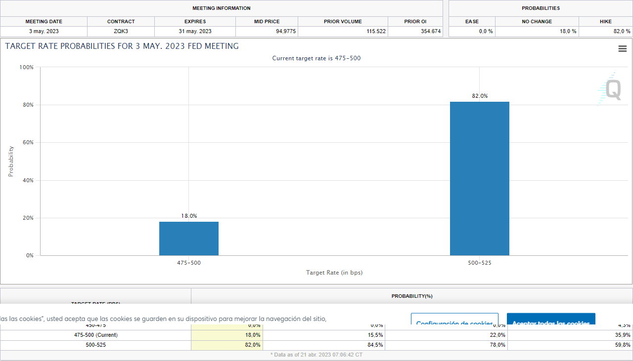 On the other hand, the Fed's usual hawks claimed more action, but the market does not change its view for a 25 bps rate hike coming up. According to the CME FedWatch tool, odds for such an increase stand at 82%.