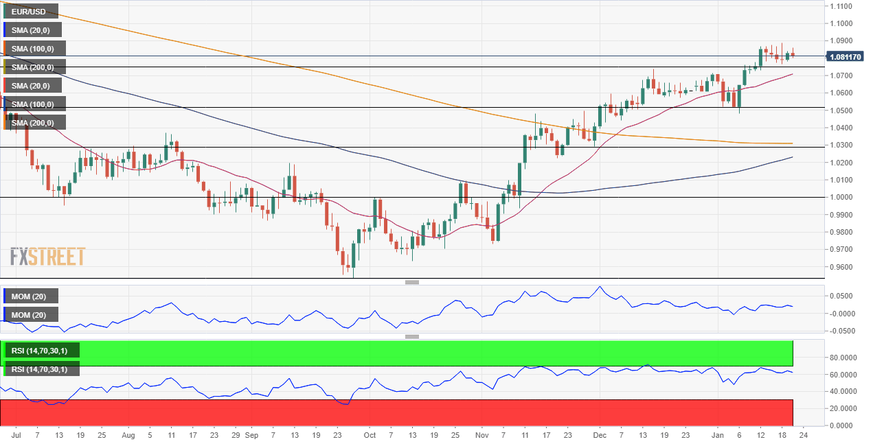 On a daily basis, technical readings reflect a similar picture to that seen in the larger time frame. EUR/USD bottomed for the week at 1.0765, meeting buyers ahead of the aforementioned Fibonacci support. Technical indicators lack directional strength, the Momentum flat within neutral levels, and the Relative Strength Index (RSI) hovering at around 61, in line with absent bears. At the same time, the 20 SMA advanced throughout the week, maintaining its upward slope a handful of pips below 1.0745. The longer moving averages, in the meantime, slowly grind north below the shorter one, but the 100 SMA still stands far below a flat 200 SMA.