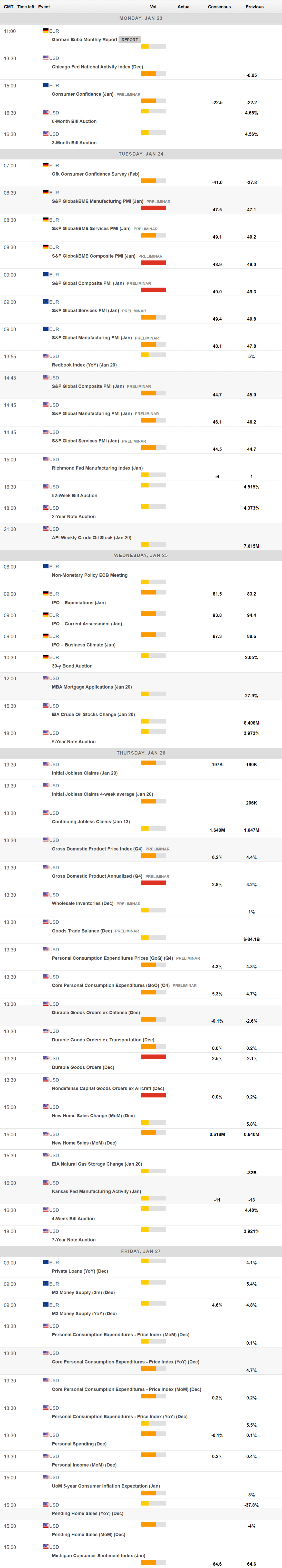 The upcoming week will shed some light on how economic growth is doing. On Tuesday, S&P Global will release the preliminary estimates of its January PMIs for the Euro Zone and the United States. Business activity is expected to remain in contraction territory, although also to improve from the December levels.