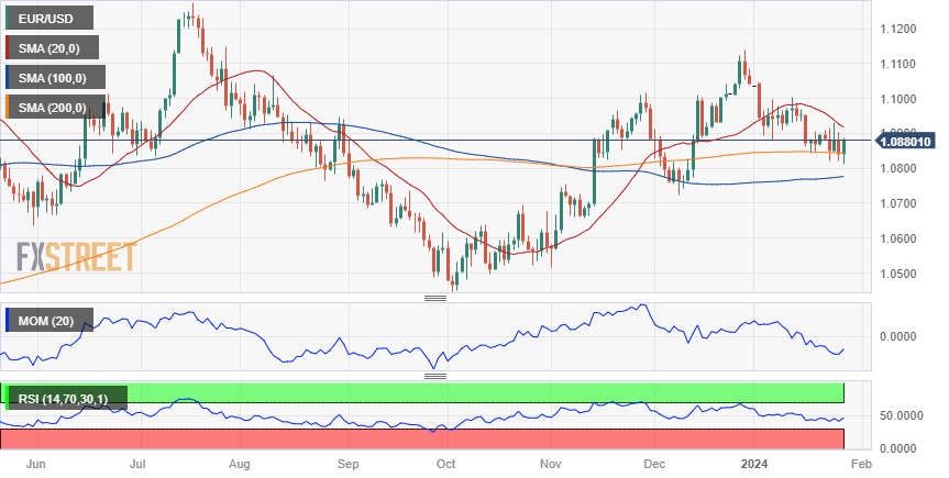 In the daily chart, EUR/USD pierced several times a directionless 200 Simple Moving Average (SMA) at around 1.0845 but quickly returned above it, suggesting buyers are still willing to defend the area around the indicator. Still, the 20 SMA continues to gain downward traction well above the current level. Finally, technical indicators remain lifeless within negative levels, skewing the risk to the downside without clearly confirming so.
