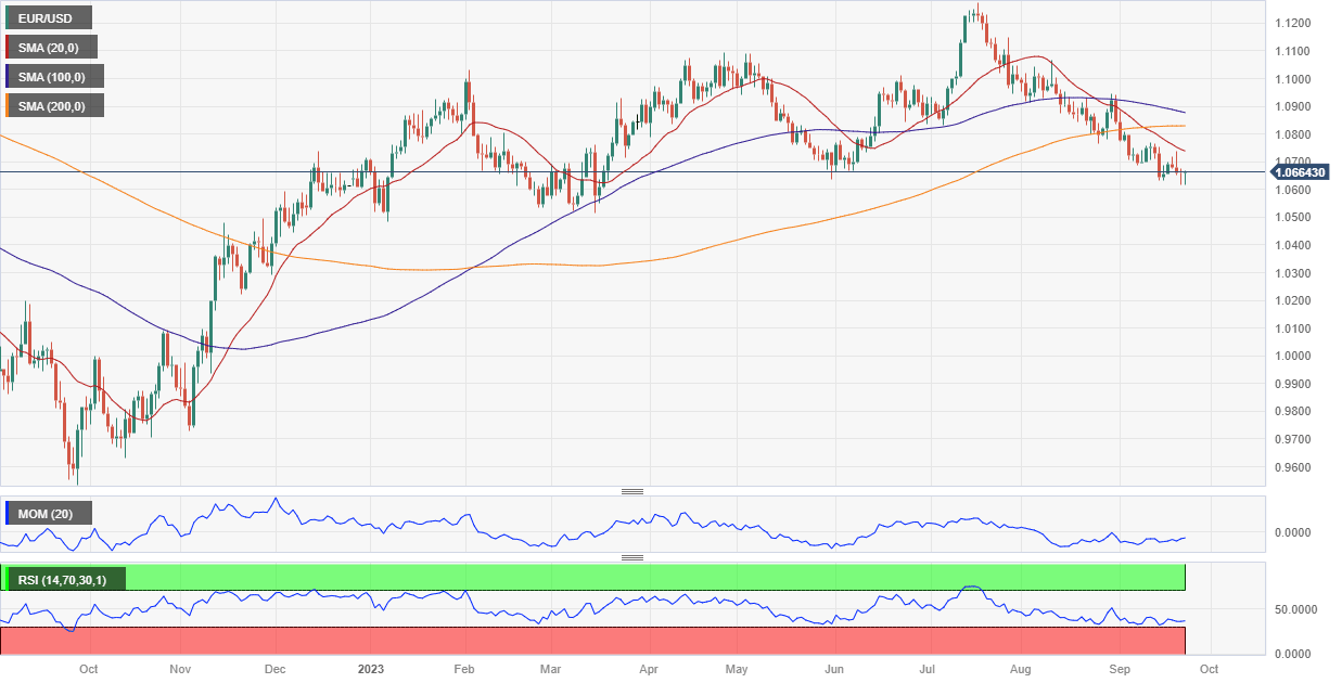 The weekly chart shows that a bearish 100 Simple Moving Average (SMA) provided dynamic resistance, maintaining its bearish slope at around 1.0730. The 20 SMA, in the meantime, gains bearish traction above the longer one, in line with persistent selling interest. Meanwhile, the Momentum indicator heads firmly south within negative levels, while the Relative Strength Index (RSI) indicator consolidates at around 41, skewing the risk to the downside.