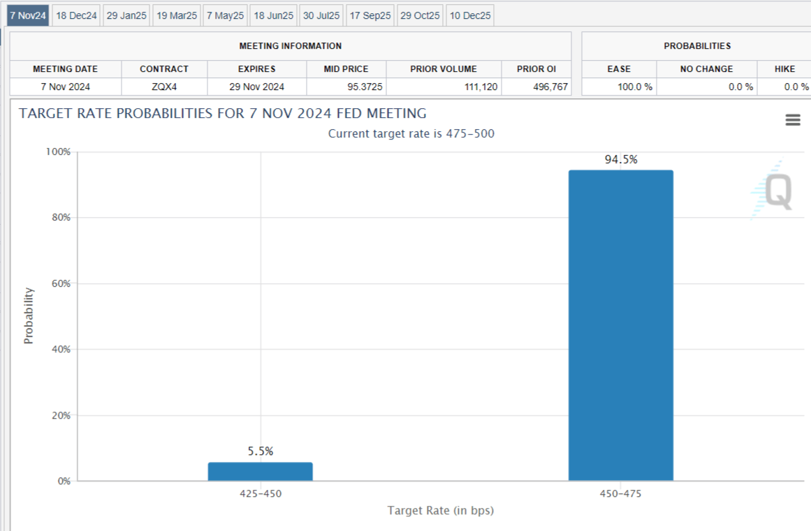 At the end of the week, the odds for a 50 bps rate cut from the Fed plummeted to 5.5%, although the other 94.5% foresees a 25 bps trim.