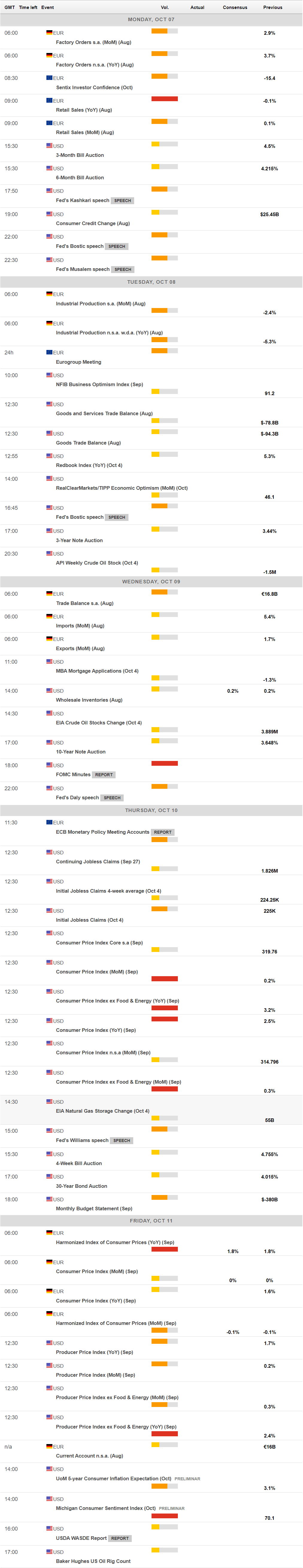 The upcoming week will feature a couple of critical macroeconomic reports. The US will publish the Federal Open Market Committee (FOMC) meeting Minutes on Wednesday and the September Consumer Price Index (CPI), previously at 2.5% YoY on Thursday. The country will also publish September PPI data and the preliminary estimate of the October Michigan Consumer Sentiment Index on Friday. Across the pond, the calendar will be a tad lighter as the EU will unveil August Retail Sales on Monday and the ECB Monetary Policy Meeting Accounts on Thursday.