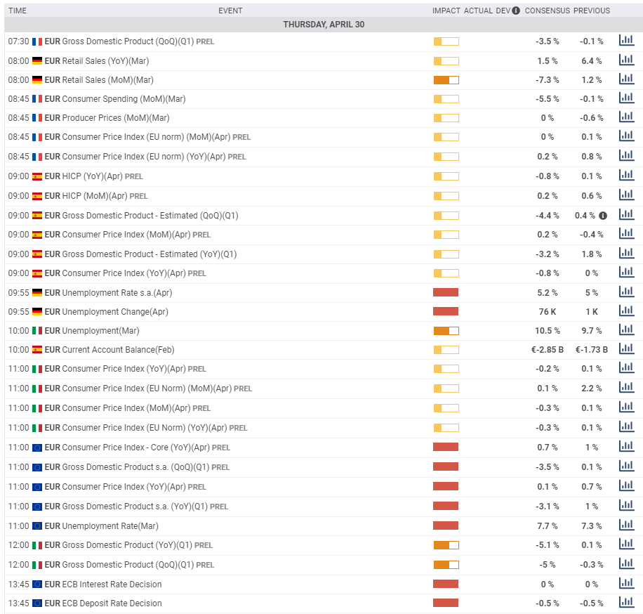 The publication for the whole eurozone is preceded by figures from France, the second-largest economy, which is set to suffer along the lines of the entire bloc. Spain, the fourth-largest economy that imposed a strict lockdown, is next up, and contraction is set to hit 4.4% quarterly. Italy, the third-largest economy, may have seen output fall by 5%.