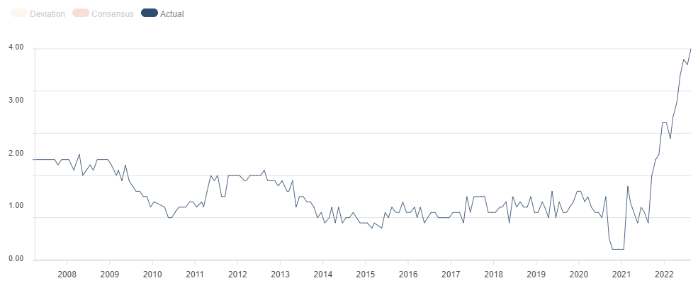 The Eurozone Harmonised Index of Consumer Prices (HICP) hit a new record high of 8.9% in July, surpassing expectations of a steady reading of 8.6%. Meanwhile, the core HICP jumped to 4.0% YoY in the reported month when compared to the 3.8% estimate and 3.7% previous.