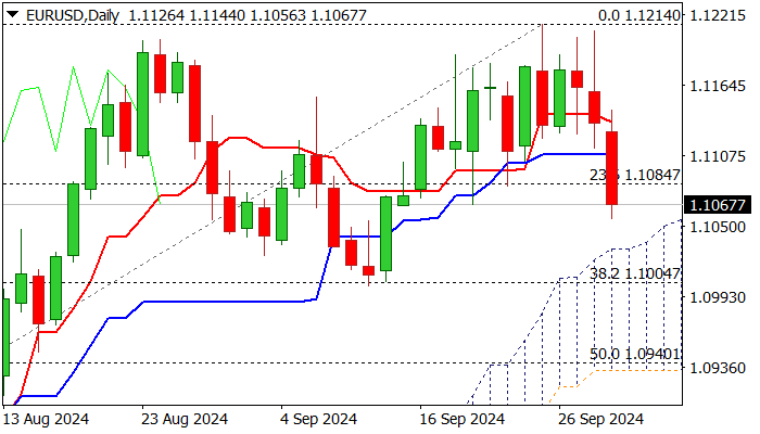 EURUSD ticked higher from three-week low (1.1056) in the US session on Tuesday but remains firmly in red after being deflated by risk aversion on deteriorating geopolitical situation and EU September CPI below target, fueling expectations for another ECB rate cut.