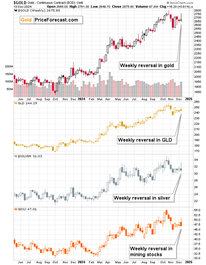 Gold ended the week $16.20 higher than it had opened it, but it matters little compared to the fact that on an intraweek basis, gold erased almost $100 (declining from $2,761.30 to $2,675.80). In other words, we saw a profound weekly reversal; and it wasn’t profound just because of the size of the price swings – the high volume confirmed it.