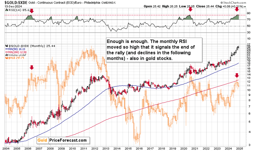 Gold price in terms of the euro had rallied substantially in the previous months, but based on the RSI indicator it rallied too far too fast, and it now needs to correct or decline in a more profound manner. That’s simply how the markets work. No market moves up or down without periodic corrections. Gold is no exception.