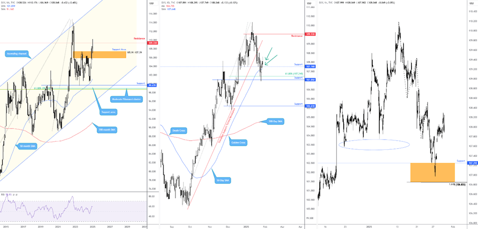 For those who regularly read our blog, you will note that I released a technical view of the USD via the US Dollar Index, consisting of monthly, daily and H1 timeframes. The charts showcased evidence supporting a bullish USD bias. I will not go into detail here, but we are now north of daily resistance from 107.77, which is important and perhaps unlocks the door for further buying towards monthly resistance at 109.33.