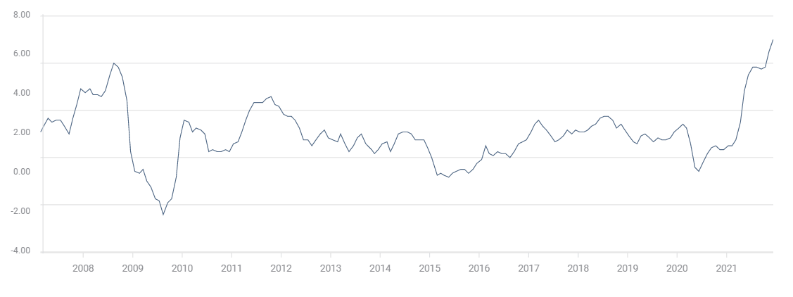 In the six weeks since the November 3 FOMC, recorded CPI has gone from 5.4% to 6.8%.