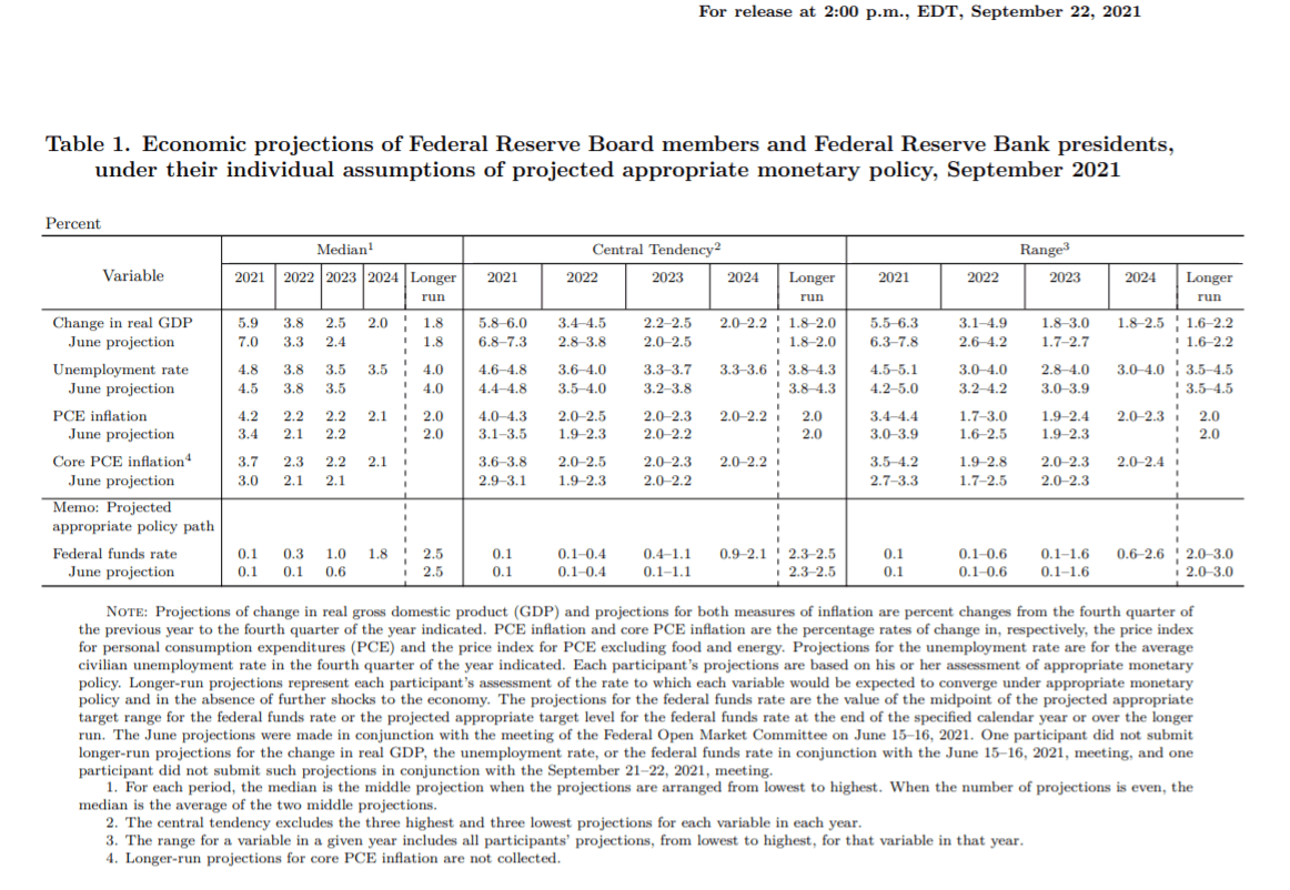 September’s Projections Materials are below. The important changes in the September release were the addition of one fed funds hike in 2022, in June there was none, the increase in the PCE inflation rate to 4.2% from 3.4% and the core rate to 3.7% from 3.0%. Both of those PCE rate projections for the year end have already been surpassed. The core rate was 4.1% in October as above and the overall rate was 5.0%. Inflation in 2022 was forecast to be 2.2% in headline and 2.3% in core.