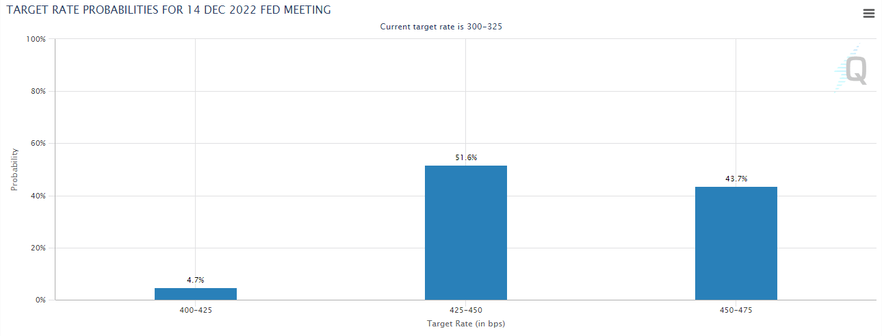 According to the CME Group’s FedWatch Tool, the probability of a 75 bps hike this week stands at around 90%. In December, however, there is a 51% chance of the Fed opting for a smaller 50 bps rate increase.