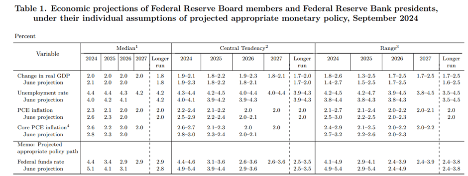 According to the 2024 projections, Fed officials raised the unemployment rate to 4.4% from 4.0% in the last update in June. PCE inflation projections were lowered to 2.3% from 2.6% (previous forecast), with core PCE inflation projections reduced to 2.6% from 2.8% (previous forecast), and the change in real Gross Domestic Product (GDP) is expected to rise to 2.0% down from 2.1% (previous forecast).
