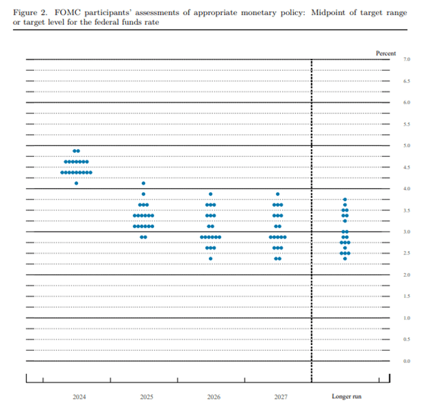 You will also see that alongside Fed officials projecting 50bps of cuts this year to 4.4%, it is projected to fall another 100bps in 2025 to 3.4% and another 50bps lower in 2026 to 2.9%, now the central bank’s long-run neutral rate.