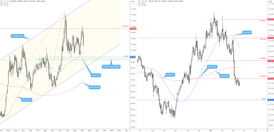 As illustrated on the monthly and daily charts below, sellers are strengthening their grip. Monthly flow demonstrates scope to test the 50-month simple moving average (SMA), currently trading at 101.72. I feel this will be a particularly strong technical floor, which happens to be backed by the support of around 99.67. Adding to this bearish scenario, price action on the daily chart recently ventured south of support from 103.94 and retested said boundary as resistance at the tail end of last week. I have found these levels – Quasimodo barriers – particularly effective on retest plays, which is what we have here. And given the absence of any obvious support until 101.92, USD bears will likely remain in the driving seat for the time being and any pullbacks will likely be faded.