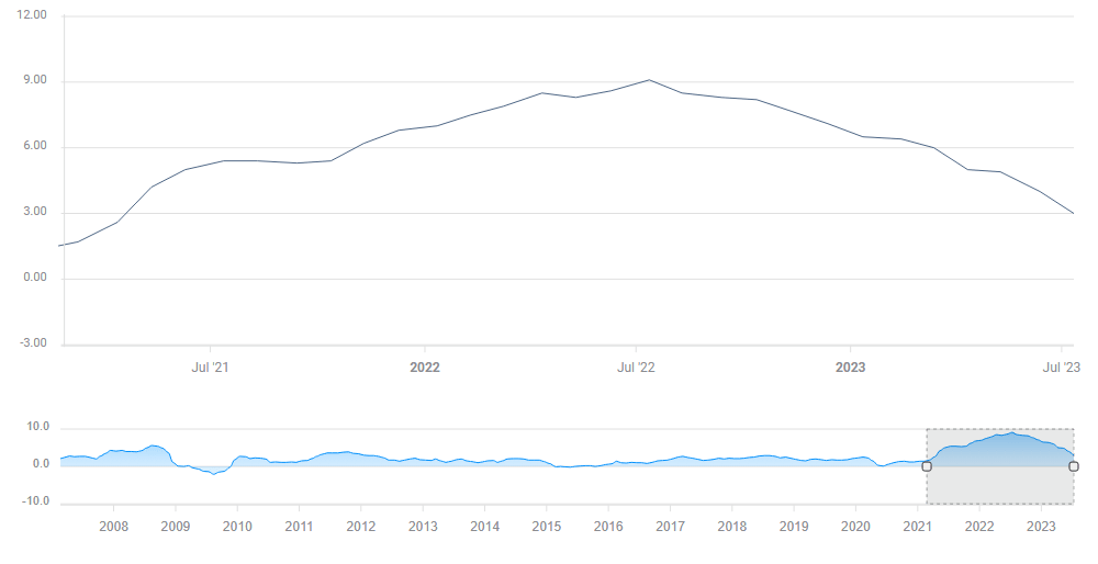 The Fed focuses on core inflation, which excludes prices of volatile energy and food prices/costs set on global markets, and are harder to influence. Also on this front, the bank can tap on its back with a sense of achievement – the Core Consumer Price Index (Core CPI) rate fell from 6.6% to 4.8% YoY in June.