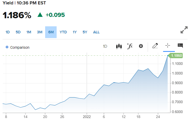 Treasury yields saw the reverse movement. The 2-year yield added 16 basis points to 1.186% and the 5-year return rose 12 points to 1.688%, both pandemic highs. The commercial benchmark 10-year Treasury interest rate climbed 7 points to 1.855%, just below the 1.868% two-year high set on January 18. The 30-year bond yield added 2 points to 2.153% and alone remains well below its March 2021 high close at 2.476%.