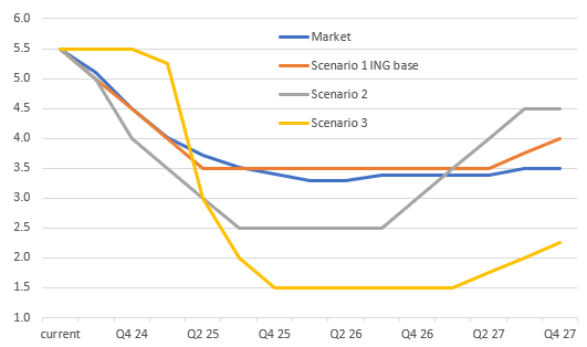Inflation remains stickier than hoped and forces the Fed to keep policy tighter for longer. With the jobs market weakening, stagflation fears rise. A deepening recession from late 2024 into early 2025 helps to dampen price pressures, giving the Fed scope to start cutting rates from the late first quarter of 2025. The Fed need to go harder and faster to offer support for the economy and prevent inflation from undershooting its target too much. Monetary policy moves into stimulative territory and then it starts to normalise from mid-2027 onwards.