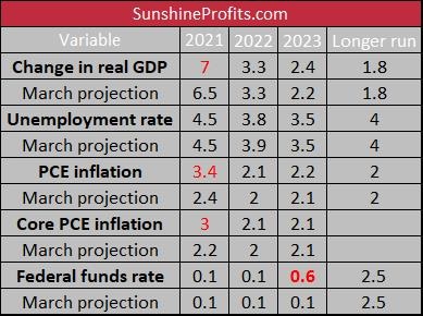 As one can see, the FOMC expects that the GDP will soar 7% in 2021, compared to a 6.5% rise expected in March. They also assume that the pace of economic growth will be slightly higher in 2023. Meanwhile, the Fed officials believe now that the PCE inflation (core PCE) will jump to 3.4% (3%) this year , compared to 2.4% (2.2%) seen in March. They also forecast a slightly lower unemployment rate in 2022.