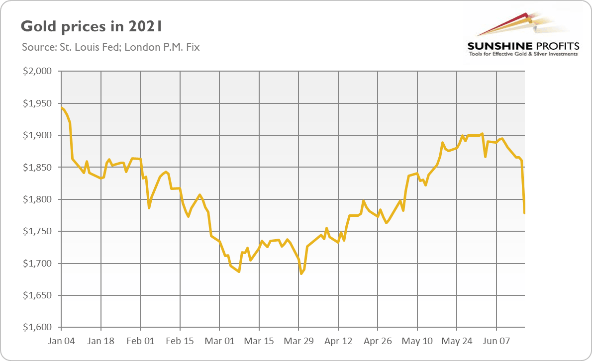 What does the recent FOMC meeting imply for the gold market? Well, the Fed struck again. As a result, the price of gold plunged. As the chart below shows, the London P.M. Fix slid from about $1,865 on Tuesday to $1779 on Thursday.