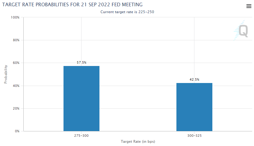 According to the CME Group FedWatch Tool, markets are currently pricing in a 42.5% chance of a 75 bps hike in September.