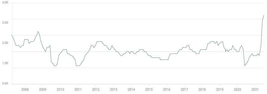 The Consumer Price Index (CPI) has more than tripled in six months from 1.4% in January to 5.4% in June. Even the Fed's preferred Personal Consumption Expenditure Price Index (PCE) has more than doubled from 1.5% in January to 3.4% in May. It is expected to rise to 3.7% in June when it is released by the Bureau of Economic Analysis on Friday. If accurate, it would be the highest core inflation rate in more than three decades, since March 1991.