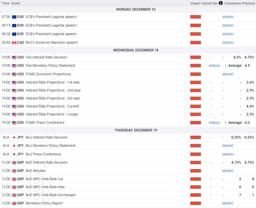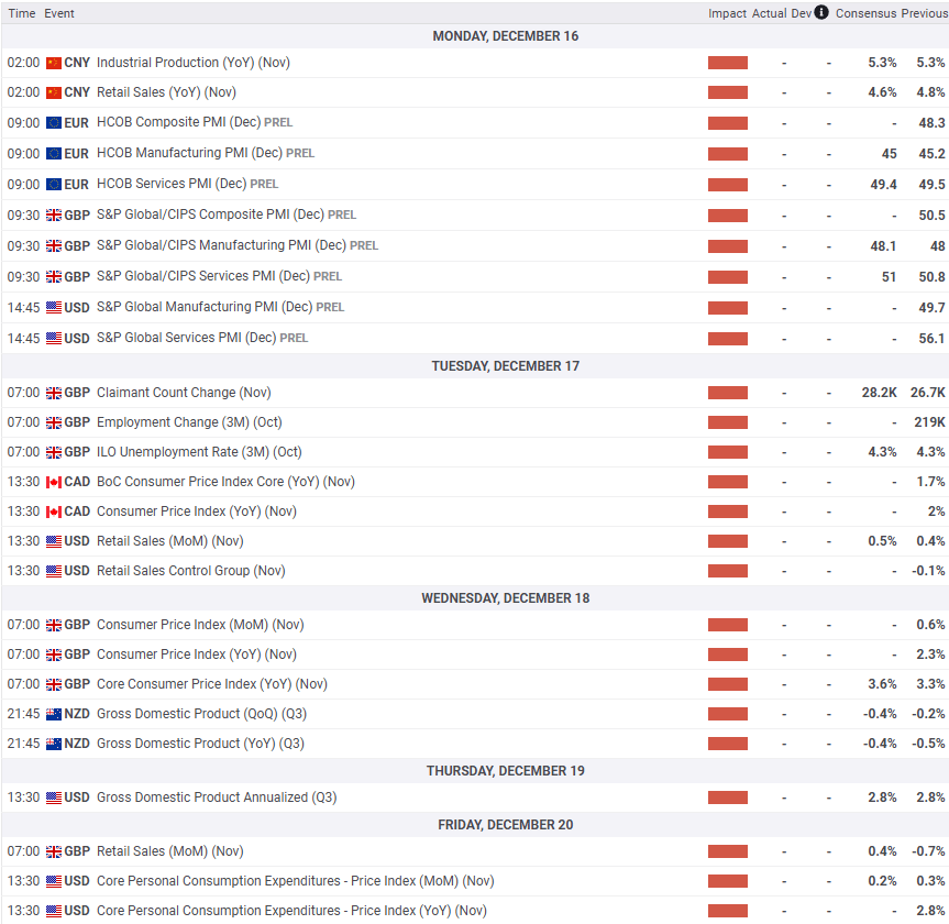 The US Dollar Index (DXY) posted a strong week, climbing nine-tenths of a percent and battling the 107.00 handle as market sentiment tentatively pivots back into the safe haven Greenback. Next week will see a continuation of US-centric market focus: US Purchasing Managers Index (PMI) figures are due on Monday, but the key event next week will be the Federal Reserve’s (Fed) final rate call of 2024 on Wednesday. Markets are widely anticipating a third straight quarter-point rate trim for 25 bps, but a recent upswing in US inflation metrics could begin to challenge market hopes for a continued rate cut schedule heading into 2025. Next Friday will round out a tense week with a fresh update to US Core Personal Consumption Expenditures Price Index (PCEPI) inflation data for November.