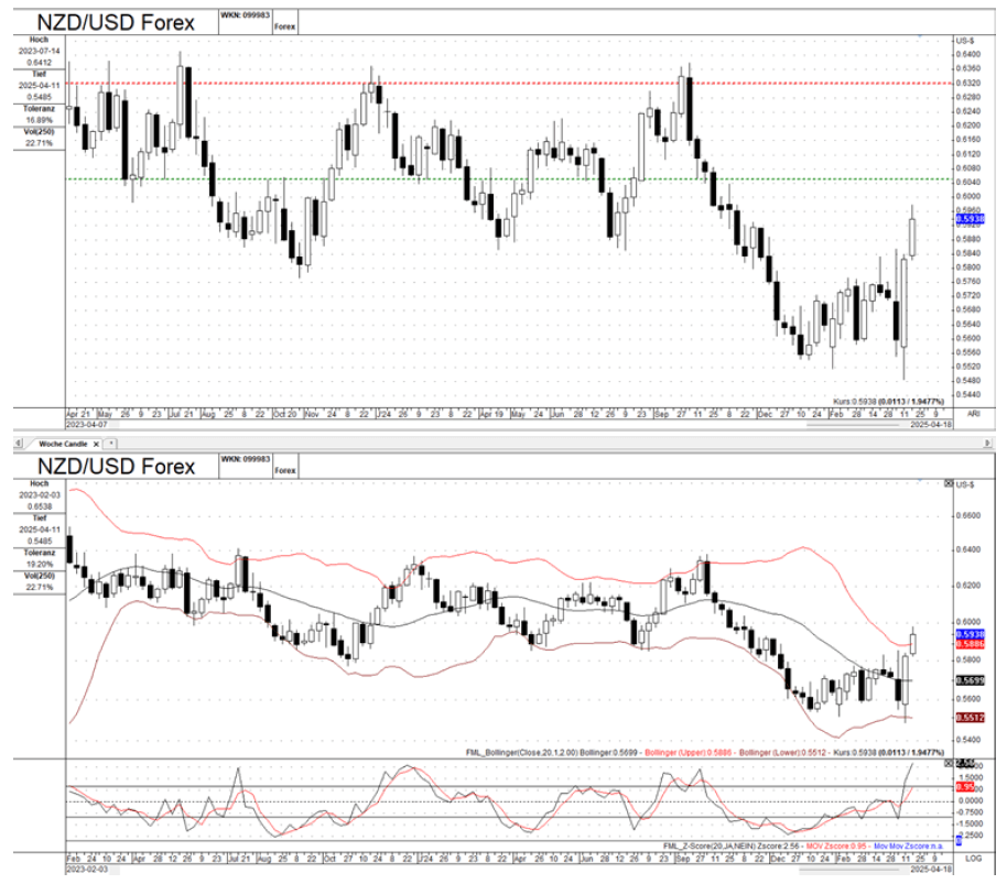 Chart 2 (Bollinger Bands/Z-score): The price is trading above the upper Bollinger Band, indicating overbought conditions. The Z-score is highly positive, reinforcing this overbought state.