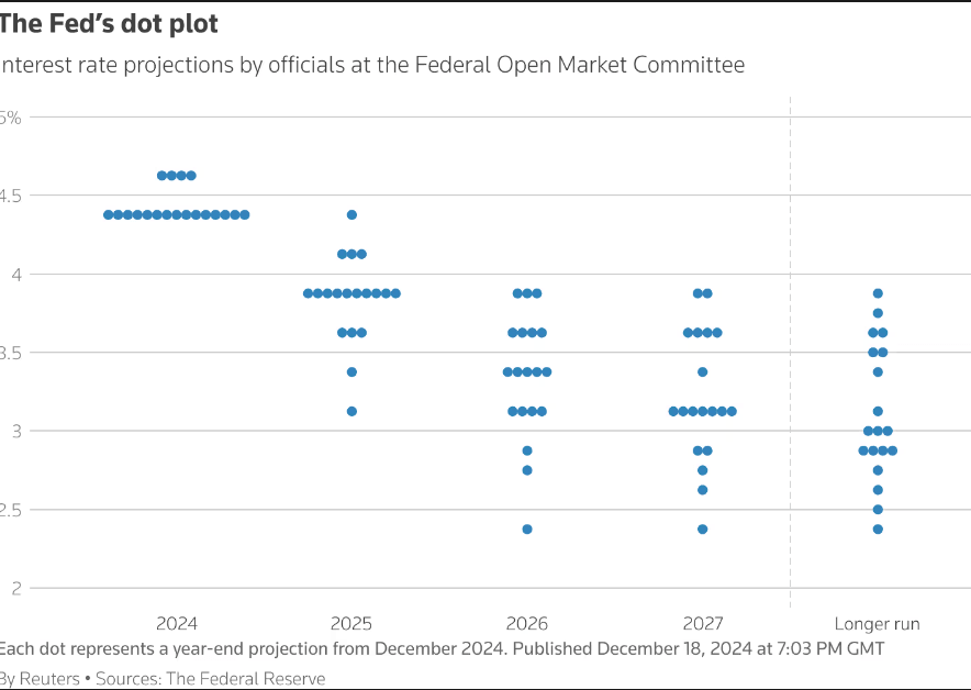Against that backdrop, Fed officials pencilled in half a percentage point in policy easing next year rather than the full percentage point officials anticipated as of September.