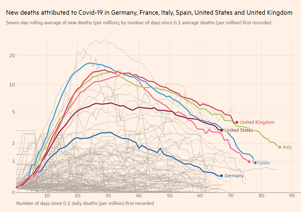 A seven-day rolling average of new deaths (per million), by number of days since 0.1 average deaths (per million) first recorded